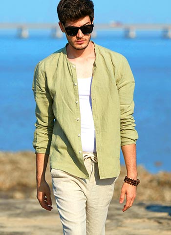 棉麻草綠色襯衫內搭白色背心,搭配米色長褲,屬于時尚、休閑的風格,是非常帥氣的。特別適合夏天在非正式場合下聚會朋友。