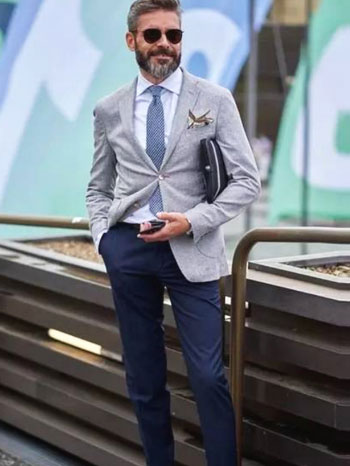 2、灰色西裝下搭藏青西褲+棕色皮鞋更顯商務休閑氣息,領帶選擇藍色款與褲子的色彩呼應更有造型感。