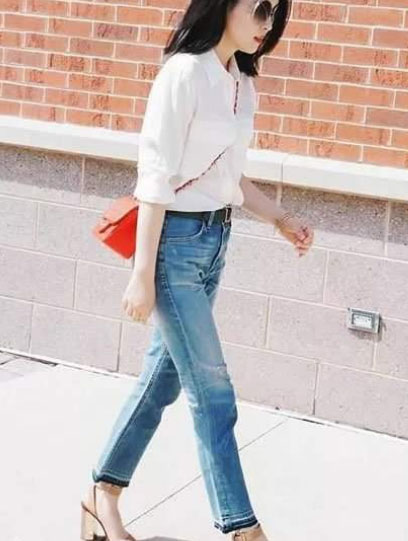 2.純色襯衫和牛仔褲搭配。當溫柔淑女氣質的純色襯衫遇上休閑青春的牛仔褲時,兩者之間摩擦出來的是既休閑氣質又很時尚的時髦穿搭。純色襯衫和牛仔褲搭配,在配上運動鞋或小白鞋,即可以瞬間將人帶入青春的記憶,具有青春的活力。這種搭配非常適合學生聚會,去玩和約會。