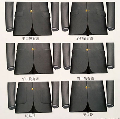 前袋一般包括有袋蓋、無袋蓋和貼袋三類,有袋蓋與無袋蓋常見的有平袋與斜袋兩種。在各種口袋中,有袋蓋的口袋是最常見的,適合于多數人,如果你的肚子特別大的,則不建議采用。斜袋蓋的口袋比較有特色,適合于時尚的人士。無蓋的口袋比較適合肚子比較明顯的人,它會讓肚子看起來不那么明顯。明貼袋的口袋屬于休閑的風格,適合于用在比較寬松的西裝上。胸袋一般包括直袋、明袋和船型袋等。