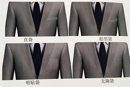 西裝的口袋分為前袋、胸袋、票袋和內袋等。