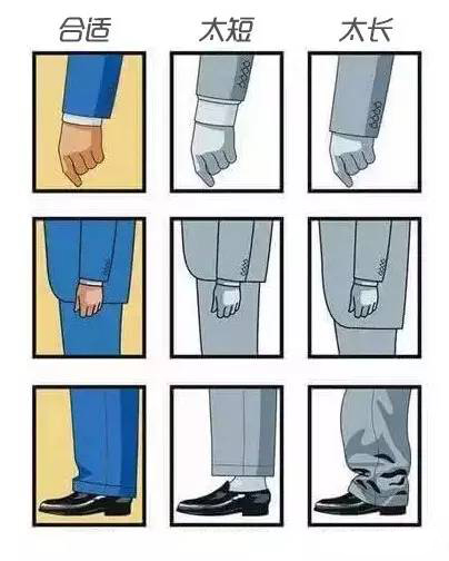 我們先來看一張西服合身標(biāo)準(zhǔn)圖,示圖第一列為正確穿著標(biāo)準(zhǔn):