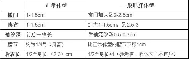 比較正常體型與一般肥胖體型的西服樣板的數據差異: