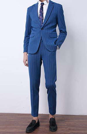 藍色條紋西裝也是比較適合夏季的,這種條紋西裝套裝修身、休閑,視覺上也比較端正大方,如果在夏季結婚,這種小西裝也是比較適合的。