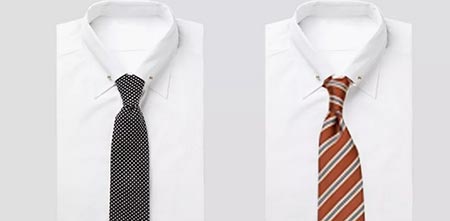 商務正裝襯衫搭配素面或條紋領帶,是比較根深蒂固的搭配方案,其中,素面領帶通常配合制服,以表達嚴肅的商務社交。條紋領帶包括常青藤風格的搭配、俱樂部風格的領帶搭配等,此外,較為規則的點、菱塊、方塊等圖案也可以出現在要求相對不太嚴格的正式辦公場所。